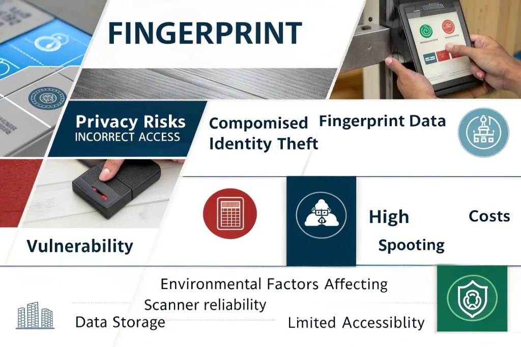 Biometric fingerprint scanners pose privacy risks, require high initial costs, and can be vulnerable to spoofing. Environmental factors may also affect their reliability.