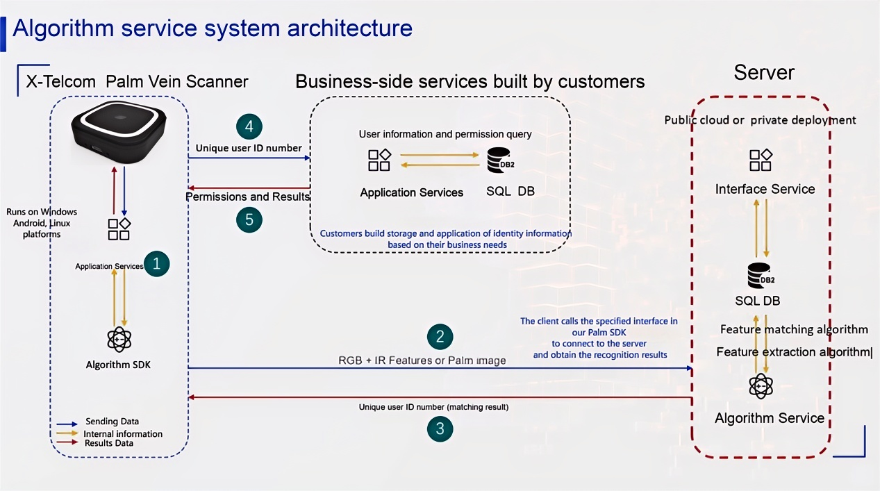 When a user places their palm in front of an X-Telcom Palm Vein Scanner (such as the XT-PalmVein 01), the embedded SDK—running on Android, Linux, or Windows—triggers the Palm Vein Recognition process.