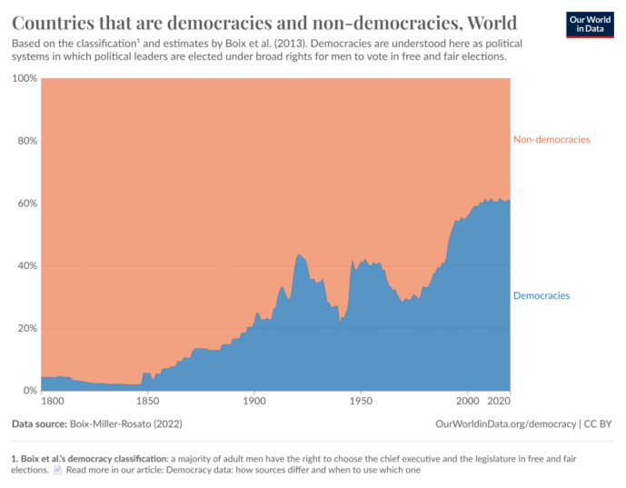 According to Our World in Data, a project overseen by the University of Oxford, based on academic research and classifications, in 2021 around 60% of the world’s countries were democracies.