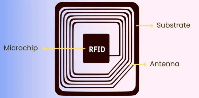 An RFID system has two main parts – a tag and a reader. The RFID tag contains a small chip that stores information, and when it gets near an RFID reader (a device that sends out radio signals), the tag sends back the stored information. This is like how a barcode works but with radio waves instead of scanning with light.