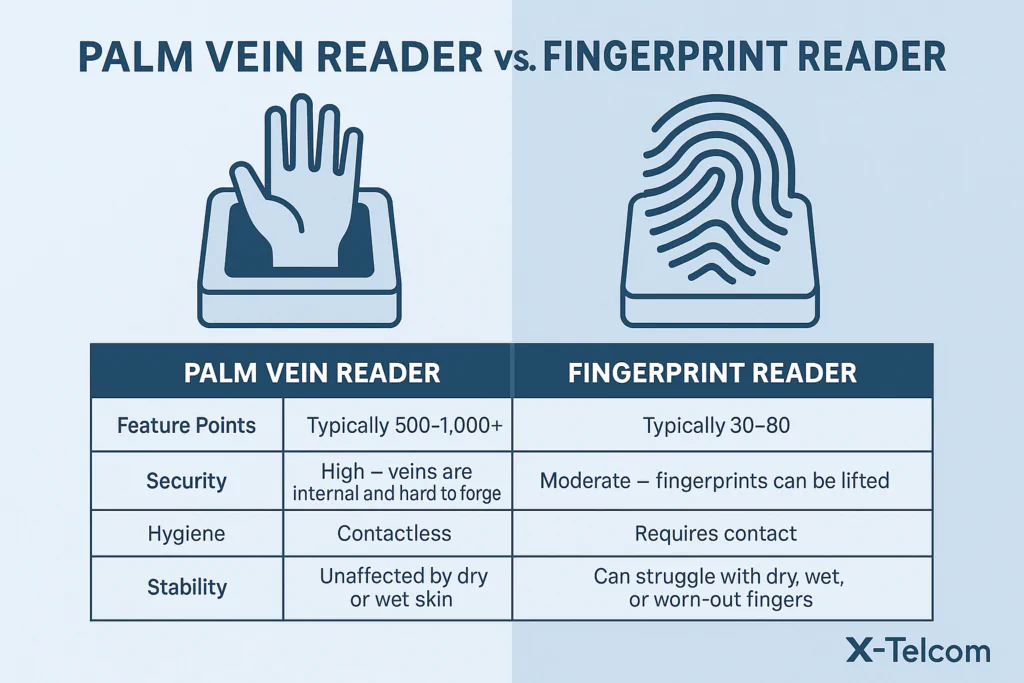 As biometric technologies continue to transform secure authentication, two standout solutions are gaining traction: fingerprint verification and Palm Vein Recognition Technology. At X-Telcom, we specialize in delivering cutting-edge biometric solutions, including Palm Vein Readers, to meet the evolving security needs of enterprises worldwide. Let’s explore how these two technologies differ — and why one might be the right choice for your business.